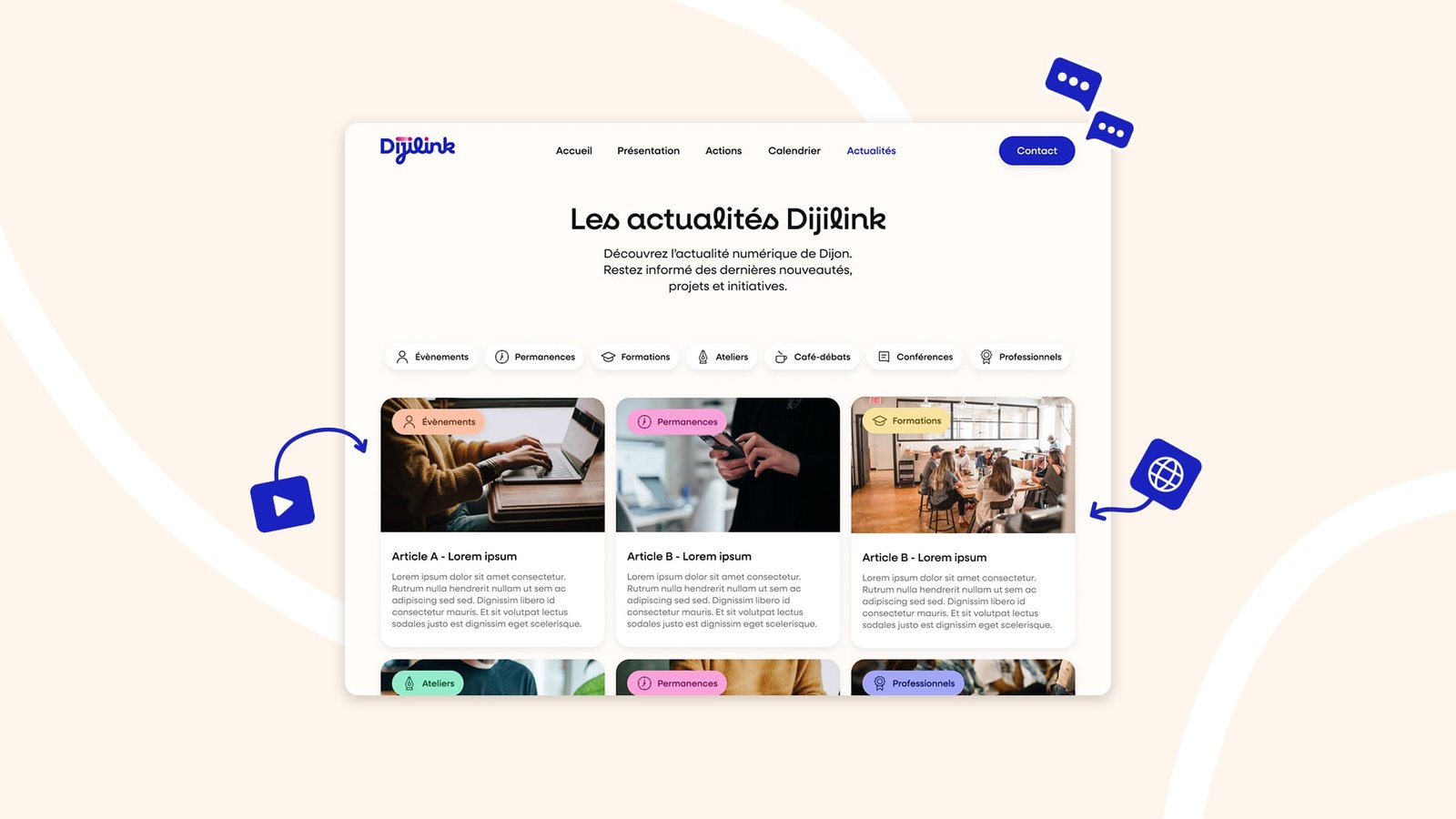 Dijilink souhaitait disposer d’un site clair, facile à comprendre dès le premier regard, et capable de mettre en lumière l’ensemble de leurs actions. L’enjeu était double : créer une véritable vitrine du dispositif tout en offrant une plateforme que l’équipe pouvait administrer en totale autonomie. Le nouveau site devait également faciliter l’accès à l’information et encourager les habitants à participer aux événements proposés.